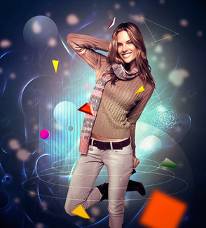 Далее, создайте новый слой поверх девушки, поменяйте режим наложения на Осветление Основы (Color Dodge) и примените ту же технику, чтобы создать дополнительные световые эффекты. Если они получились слишком светлые, то используйте более тёмные цветовые оттенки.