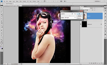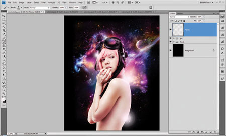 Примечание переводчика: 1. залейте задний фон чёрным цветом 2. Переместите изображение с туманностью на наш документ 3. Уменьшите размеры изображения с космосом по сравнению с задним фоном, плавный переход между краями изображения и задним фоном мы проведём в Шаге 3. 4. Продублируйте изображение и поверните продублированный слой.