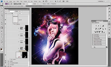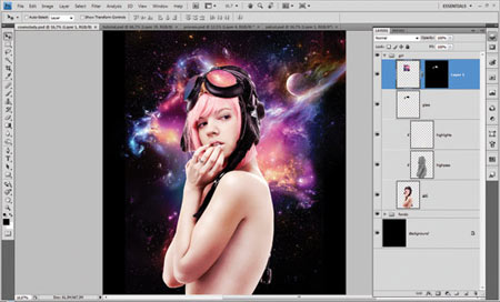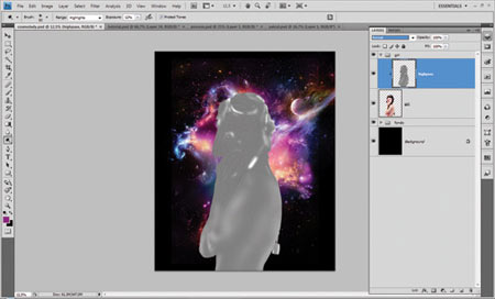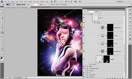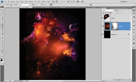 Примечание переводчика: 1. чёрной кистью прокрашивайте участки на слой-маске корректирующего слоя, которые вы хотите проявить или показать 2. Создайте группу и поместите все слои, связанные с космосом и туманностями в созданную группу.