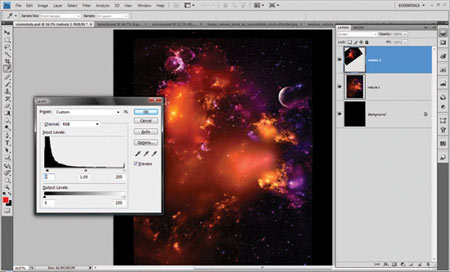 ШАГ 2. Мы добавим больше осветления и придадим галактике захватывающее настроение. С помощью уровней Ctrl + L, выставив следующие значения (9 – 1,00 – 255), и поменяем режим наложения на Осветление (screen).