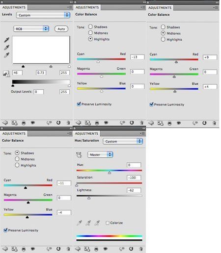 Далее, примените корректирующие слои Уровни (levels), Цветовой баланс (color balance), Цветовой тон / Насыщенность (hue/saturation) к слою с черепом животного. Не забудьте использовать корректирующие слои в качестве обтравочных масок, для того, чтобы коррекция была применима только к нижележащему слою: