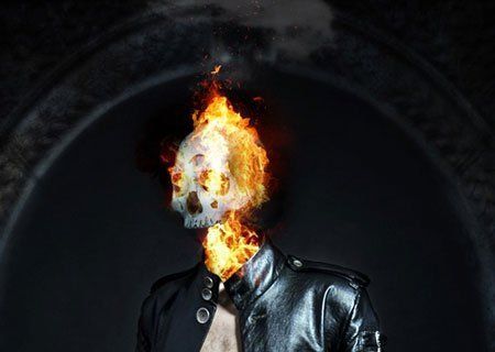 Скачайте изображение черепа по ссылке вначале этого урока. Отделите череп от заднего фона, а затем скопируйте / вклейте выделенное изображение черепа на наш документ, расположив поверх пламени, направленного верх из пиджака.