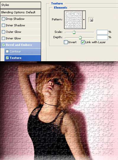 Далее выберите стиль "Тиснение", в подстиле "Текстура" установите размер и масштаб для пазлов.