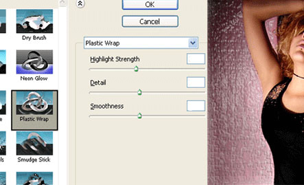 Перейдите в меню Фильтр - Галерея Фильтров... (Filter - Filter Gallery) и выберите Имитация - Целофановая упаковка ("Plastic Warp").