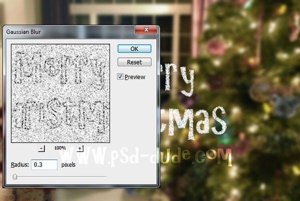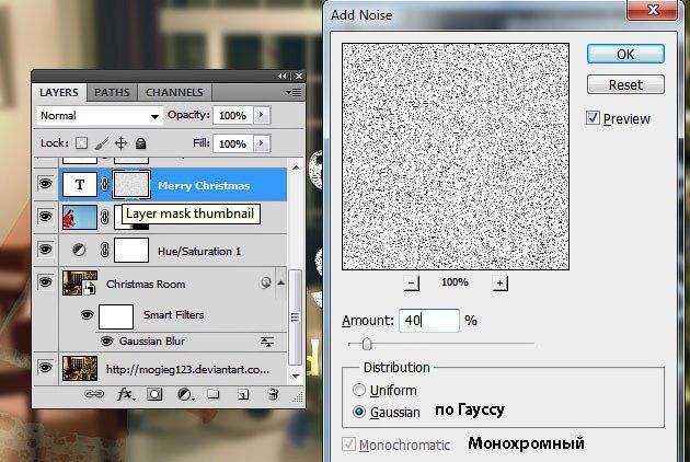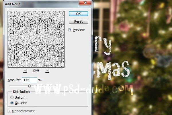 К слою с текстом ‘Merry Christmas’, добавьте слой-маску, далее, примените фильтр Добавить шум (Add Noise). Примените настройки, которые указаны на скриншоте ниже. Обратите внимание, что фильтр необходимо применить к слой-маске. Перед тем как применить фильтр, щёлкните по слой-маске слоя, чтобы она была активной.