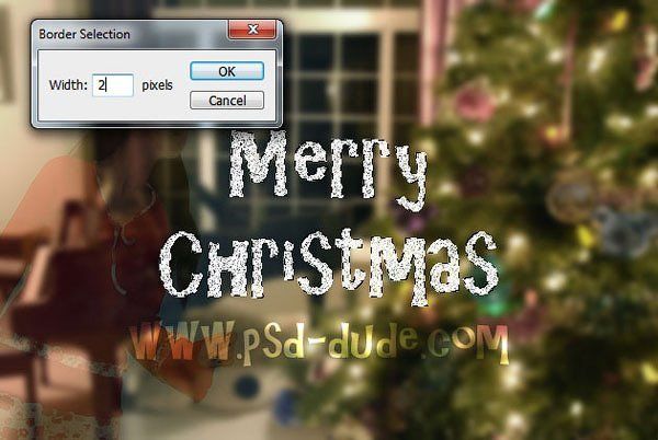 Удерживая клавишу (CTRL)+щёлкните по миниатюре слоя с текстом, чтобы загрузить активное выделение вокруг текста. Далее, идём Выделение – Модификация – Граница (Select>Modify>Border), установите выделение границы 2 px.