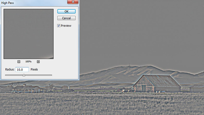 Идём Фильтр – Другое – Цветовой контраст (Filter > Other > High Pass). Установите то значение радиуса для своей фотографии, при котором края на фотографии будут слегка светиться. Для данной фотографии размерами 1,920 x 1,080 px, я использовал радиус 10 px.