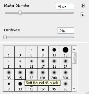 Возьмем мягкую кисть черного цвета размером 45 px. И закрасим примерно половину нашего огня, чтобы появились языки пламени.