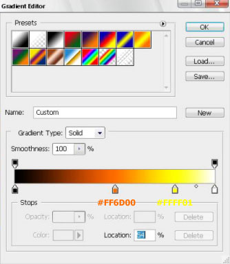 Теперь осталось только раскрасить наш огонь. Заходим Image -> adjustment ->Gradient map (Изображение->Коррекция->Карта градиента) и устанавливаем там примерно такие параметры: