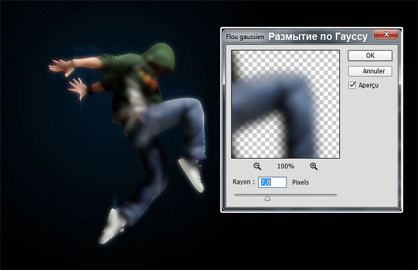 К этому слою примените фильтр Filter > Blur > Gaussian Blur (Фильтр – Размытие – Размытие по Гауссу), радиус 7 рх.