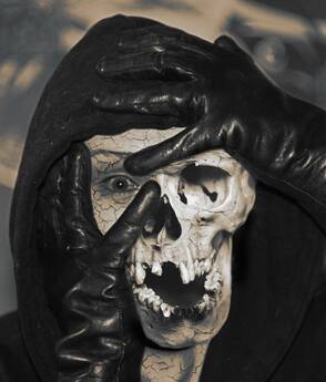 По достижению желаемого результата, верните черепу 100% уровень непрозрачности. Добавьте слой-маску для черепа. Убедившись, что активна маска, пройдитесь мягкой кистью чёрного цвета, убирая ненужные детали по краям слоя с черепом. Так же автор сделал видимыми пальцы.