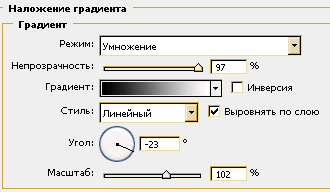 Теперь выберите Gradient overlay (Наложение градиента). Градиент поставьте от черного к белому, Blending mode (режим наложения) на Multiply (Умножение). Если нужно поменять, например, от белого к черному, то просто поставьте галочку напротив Reversed (Инверсии).