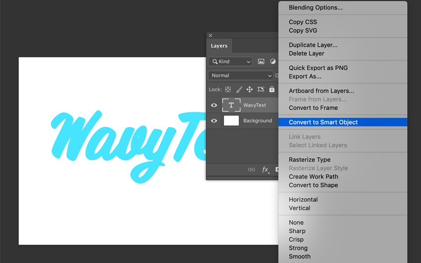Далее давайте преобразуем текстовый слой в смарт-объект. Для этого кликаем правой кнопкой по слою и выбираем Convert to Smart Object (Преобразовать в смарт-объект).