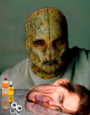 Создайте новый корректирующий слой (тёмно-зелёный) и нарисуйте морщины вокруг глаз и на лбу; создайте светлый корректирующий слой и добавьте света нарисованным морщинам
