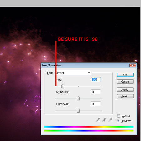 Шаг 13. Откройте изображение с Фейерверком, который Вы загружали в начале. В меню Изображение\Коррекция\Цветовой тон\Насыщенность(Image\ Adjustment\Hue/Saturations) CTRL+U)) поменяем Цветовой тон (Hue) -98. Выделяем всё изображение (CTRL+А), копируем (CTRL+С) и вставляем (CTRL+V) на изображение с лицом. CTRL+Т, клик ПКМ и выберите «Поворот на 180°»