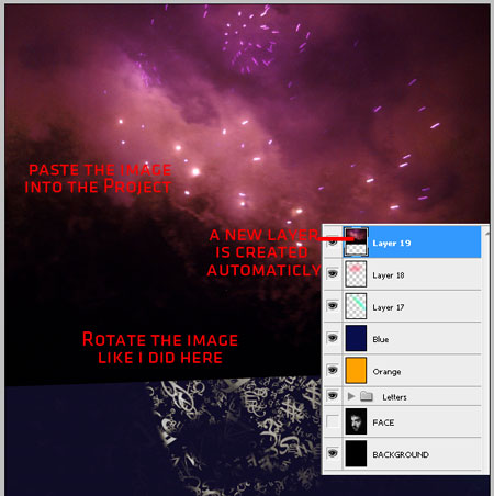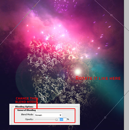 Шаг 16. Поменяйте режим наложения (Blend Mode) для слоя на «Осветление» (Screen), вы можете повернуть слой (CTRL+Т), чтобы получить результат, как показано ниже