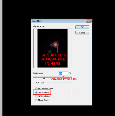 Шаг 15. Создайте новый слой, залейте чёрным цветом, в меню Фильтр\Рендеринг\Блик (Filter\Render\ Lens Flare), Яркость (Brightness) 89%, тип объектива 35 мм.