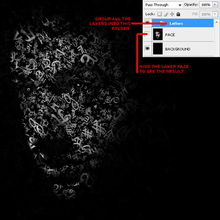 Шаг 5. Теперь повторите шаг 3 и шаг 4 столько раз, сколько посчитаете нужным (автор предлагает 8 раз) до тех пор, пока лицо не станет ясным, все слои с буквами поместите в группу (CTRL+G) (перед этим все слои нужно выделить), назовите группу «буквы»