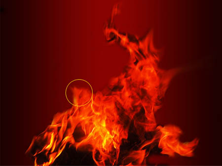 Шаг 5. Для того чтобы создать огненный эффект для фона , возьмите любое изображение огня, которое вы считаете подходящим для Вашего цветочного изображения. Автор использовал изображение Огонь. Переименуйте слой как «Огонь». Используя инструмент Палец (Smudge Tool) растяните края пламени, повторяйте этот процесс, пока Вы не увидите следующий результат.