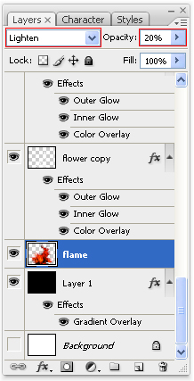 Переместите слой «Огонь» ниже слоя «Цветок копия». Измените режим наложения для этого слоя Lighten ( Замена светлым) и установите непрозрачность 20 %.