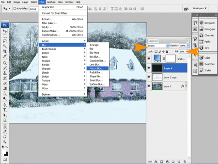 Шаг 21. Теперь установите Blending mode (Параметры смешивания) на Screen (Осветление) и Fill (Заливка) на 80%. Затем зайдите в меню Filter > Blur > Motion Blur (Фильтр > Размытие > Размытие в движении).