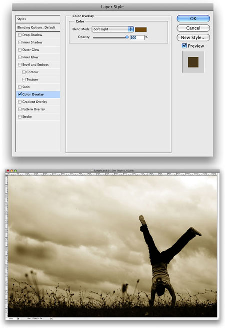 Шаг 2. Пройдите в меню Layer - Layer Style - Color Overlay (Слои - Стиль слоя - Наложение цвета). Режим наложения измените на Soft Light (Мягкий свет), цвет - коричневый (#8b5c01).