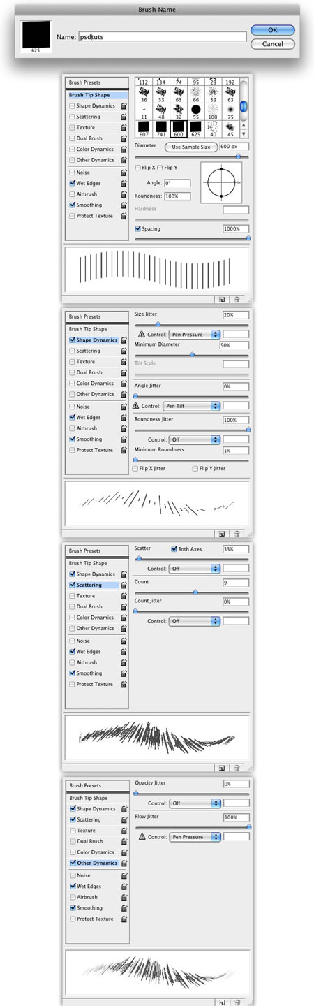 Шаг 4. Правый клик мышкой по миниатюре слоя с кистью чтобы образовать выделение. Затем Edit - Define Brush Preset (Редактирование - Определить кисть) чтобы создать кисть. Назовите кисть PSDTUTS. В Палитре Кисти найдите новую кисть и отредактируйте так, как показано ниже.