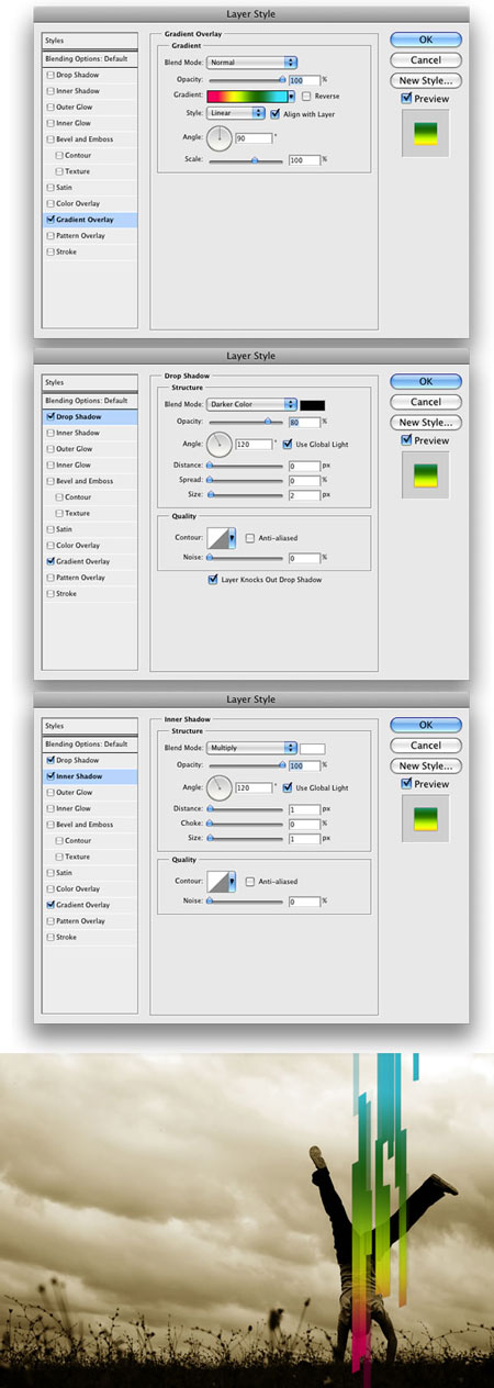 Шаг 5. Создайте новый слой, затем пройдите в меню Layer - Layer Style (Слои – Стиль слоя). Теперь применим к слою некоторые стили. Мы используем Наложение градиента, Тень, Внутренняя тень. После этого с помощью Brush Tool