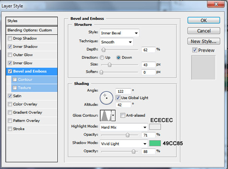 Затем Тиснение (BevelandEmboss) с такими настройками: