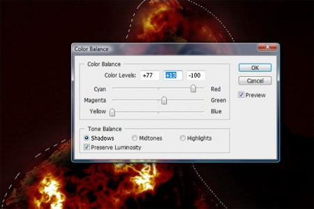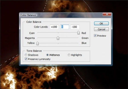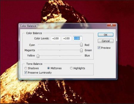 Далее Изображение -> Коррекция -> Цветовой баланс (Image -> Adjustment -> Color Balance) или CTRL+B. Примените настройки для Средние тона (Midtones)