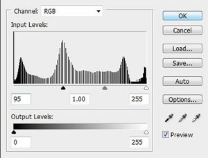 Теперь комбинацию CTRL+L или Изображение -> Коррекция -> Уровни (Image -> Adjustment -> Levels) и выставите такие параметры: