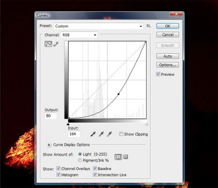 Сперва, сделаем гору темнее. Для этого создайте ее дубликат (CTRL+J), нажмите комбинацию клавиш CTRL+M, чтобы вызвать Кривые (Curves). Это команду можно также выполнить через Изображение -> Коррекция -> Кривые (Image -> Adjustment -> Curves). Выставите следующие настройки: