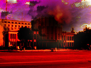 Создайте два дубликата слоя "взрыв", каждую копию трансформируйте и поверните так, чтобы создать эффект динамического взрыва (можете поэкспериментировать с Уровнями (Levels) и Кривыми (Curves)):