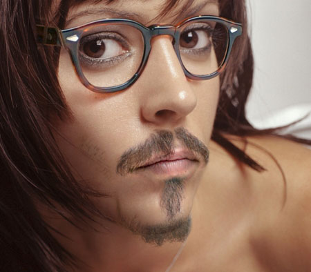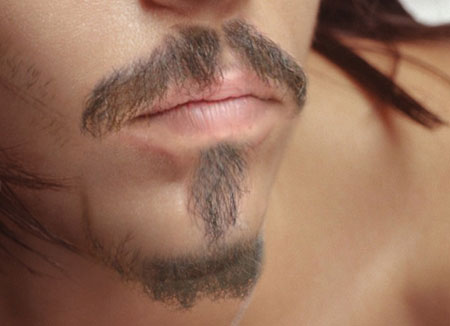 (мягкой кисти) на 45px, opacity (прозрачность) установите на 100%, проделайте те же действия, что и прежде (у вас не получится совершенного эффекта, но мы исправим это позже). Кликайте по иконке глазика у слоя cheek (щека) (это скроет слой с щетиной)каждый раз, чтобы видеть расположение волос на щеке. Измените размер кисти на 21px, а opacity (прозрачность) на 50% и дважды пройдитесь между волосами. (Помните, что 50% прозрачность при двойном применении не убирает все на 100%, она убирает лишь 50% того¸ что остается после ее применения).