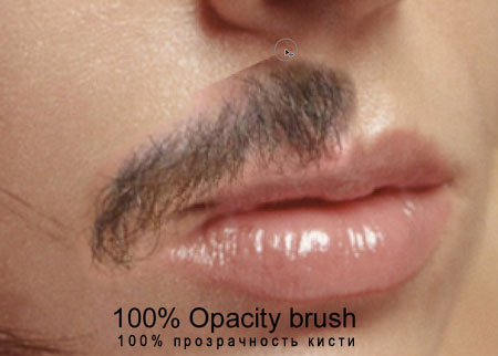 (мягкую кисть) size (размером) 17px и opacity (прозрачностью) 100%. Сотрите ей жесткие края у слоя, затем уменьшите opacity (прозрачность) до 50%, чтобы начать работу рядом с усами.