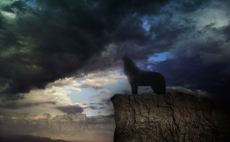 Создайте новый слой и в правом нижнем углу изображения добавим волка, который сидит на скале. Вы можете скачать эту кисть с волками.