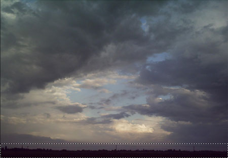 Откроем это изображение в Photoshop. Дублируем слой (ctrl+J) и назовём его "Background clouds" (или как вы сами захотите). Сделайте прямоугольное выделение и удалите нижнюю часть изображения, как на картинке ниже: