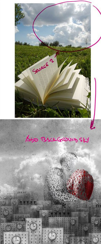 Шаг 8. Загружаем в Фотошоп изображение Clouds и вырезаем область с небом. Вставляем ее на рабочий документ в качестве фона и меняем blending mode (режим наложения) на Overlay (Перекрытие).