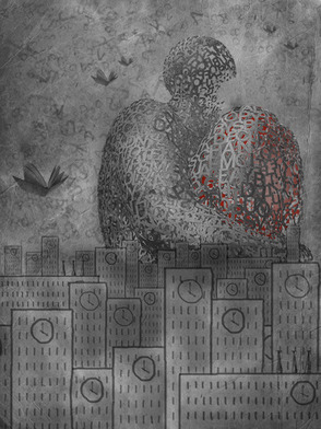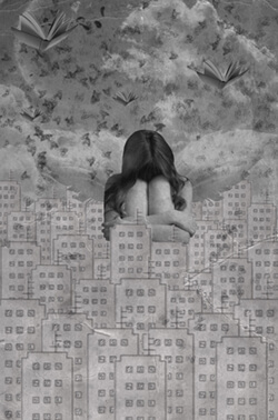 (Мел) размером 11 пикселей, рисовать элементы городского пейзажа, понизив opacity (непрозрачность) кисти до 50%, чтобы сымитировать эффект рисунка карандашом.