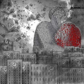 Шаг 4. Располагаем статую на документе с городом. Создаем новый слой и жесткой круглой кистью рисуем фигуру в форме сердца у ног статуи. Понижаем opacity (непрозрачность) этого слоя, чтобы сделать сердце слегка прозрачным.