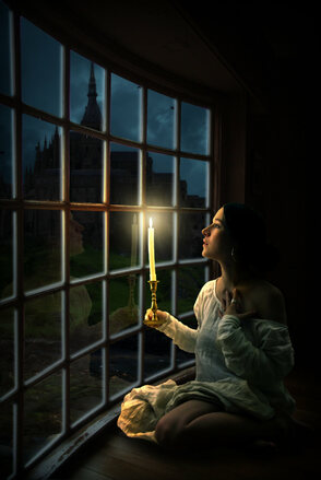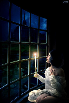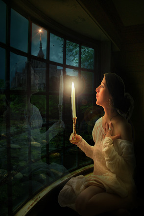 Шаг 6. Откройте изображение «Девушка». Любым из инструментов выделения выделите девушку. Правую часть можно выделять не очень старательно, потому что она у нас потом будет затемнена. Перетащите девушку на наш холст. Уменьшите размер до 45 %. Слой назовите «Candle girl» и расположите выше всех других слоев.