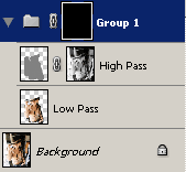 Шаг 4. Давайте поработаем для начала со слоем «Низкие частоты» (Low Pass). В панели слоев кликните по глазику напротив слоя «Высокие частоты» (High Pass), чтобы его спрятать и выберите слой «Низкие частоты» (Low Pass), над которым мы будем работать.