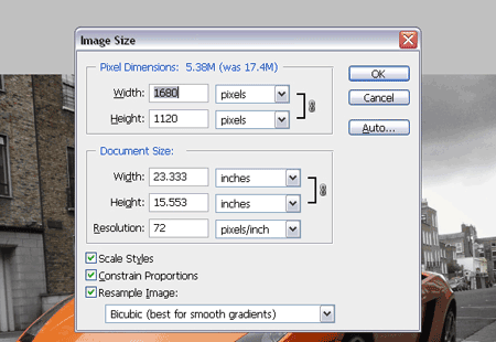 Откройте изображение с Ламборджини. Так как размеры изображения слишком велики, для начала мы уменьшим его до 1680 на 1050 пикселов. Для этого зайдите в Image > Image size (изображение – размер изображения) или нажмите Cmd/Ctrl + Alt + I на клавиатуре