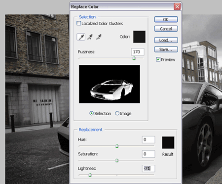 Убедитесь, что слой “Корпус машины” по-прежнему активен и зайдите в Image > Adjustments > Replace Color (изображение – коррекция – заменить цвет). В появившемся окне установите такие параметры, как на моем рисунке, но НЕ НАЖИМАЙТЕ OK!