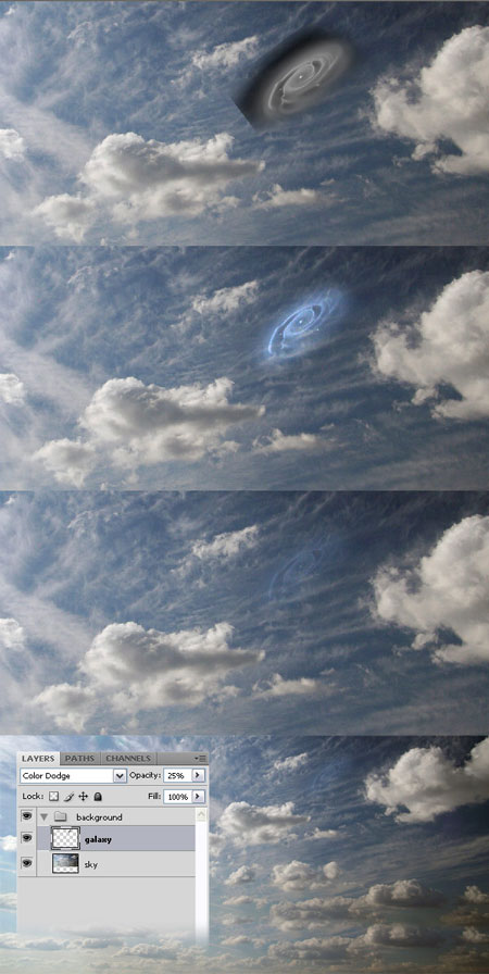 (Кисть) (B), выбираем кисточку из загруженного набора, устанавливаем цвет #8c8c8c и создаем небольшую галактику на небе. Режим смешивания устанавливаем на Color Dodge (Осветление основы) с opacity (непрозрачность) 25%.