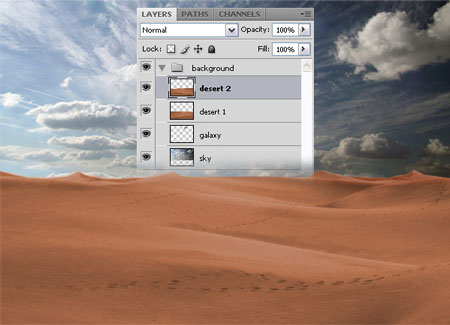 Загружаем изображение Desert 2 и импортируем в Фотошоп. Дважды кликаем по фоновому слою, чтобы разблокировать его, выделяем небо, используя Magic Wand Tool