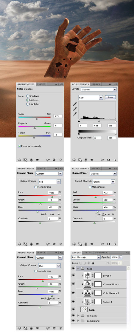Шаг 16. Добавляем три корректирующих слоя Color Balance (Цветовой баланс), Channel Mixer (Смеситель каналов) и Levels (Уровни) с параметрами, как на скриншоте выше. Все эти слои вы можете создать из меню Layer - New Adjustment Layer (Слой - Новый корректирующий слой).