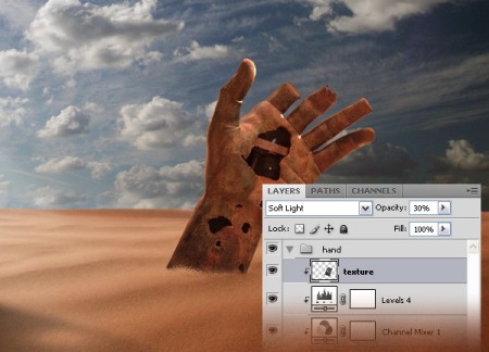 Дублируем слой "стальная маска" из одноименной группы (CTRL+J). Затем располагаем этот слой над слоем с текстурой руки и жмем CTRL+ALT+G. Устанавливаем режим смешивания на Soft Light (Мягкий свет).