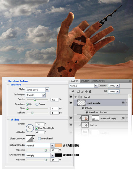 Загружаем кисти Gearing Brushes. Создаем новый слой, выбираем черный цвет и, используя одну из загруженных кистей, создаем стрелку часов, выходящую из пальца. Дважды кликаем по слою и вводим параметры, как на скриншоте выше. Называем слой "стрелка часов".