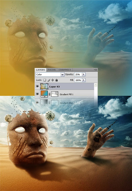 (Перемещение) (V) перемещаем изображение на основной документ и переходим Edit - Transform - Flip Horizontal (Редактирование - Трансформация - Отразить по горизонтали). Дважды кликаем по этому слою, чтобы вызвать окно Layer Style (Стиль слоя) и вводим настройки для Gradient Overlay (Перекрытие градиентом), как на скриншоте выше. Называем этот слой "пустыня 3".